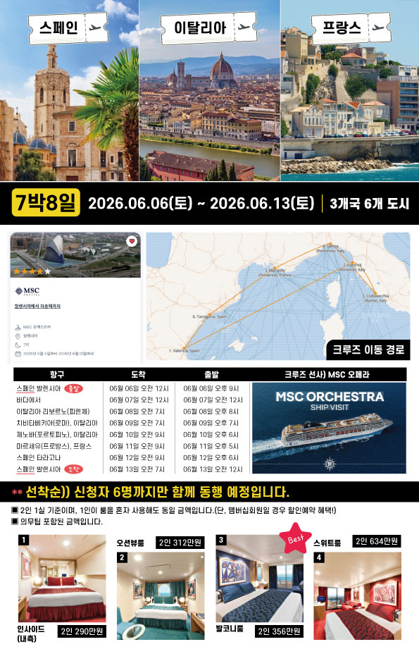 ![]() 26년 6월 6일 ~ 6월 13일 3개국 6개도시 크루즈 여행 [선착순 10명] 스페인·이탈리아·프랑스 7박 8일 크루즈 동행 신청 안내 안녕하세요! 그동안 크루즈여행에 관심으로 이 방에 계셨던 분들 중, “언젠가가 아니라 지금, 진짜 크루즈여행을 경험해보고 싶은 분들”과 함께 떠나기 위해 공지드립니다. 여행 일정 일정: 2026년 6월 6일 ~ 6월 13일 (7박 8일) 노선: 스페인 · 이탈리아 · 프랑스 지중해 크루즈 이번 여행은 ✔️ 단순한 패키지 모집이 아니라 ✔️ 크루즈여행을 직접 경험하며, 크루즈라이프와 멤버십 가치를 체감하는 ‘동행 여행’입니다. |